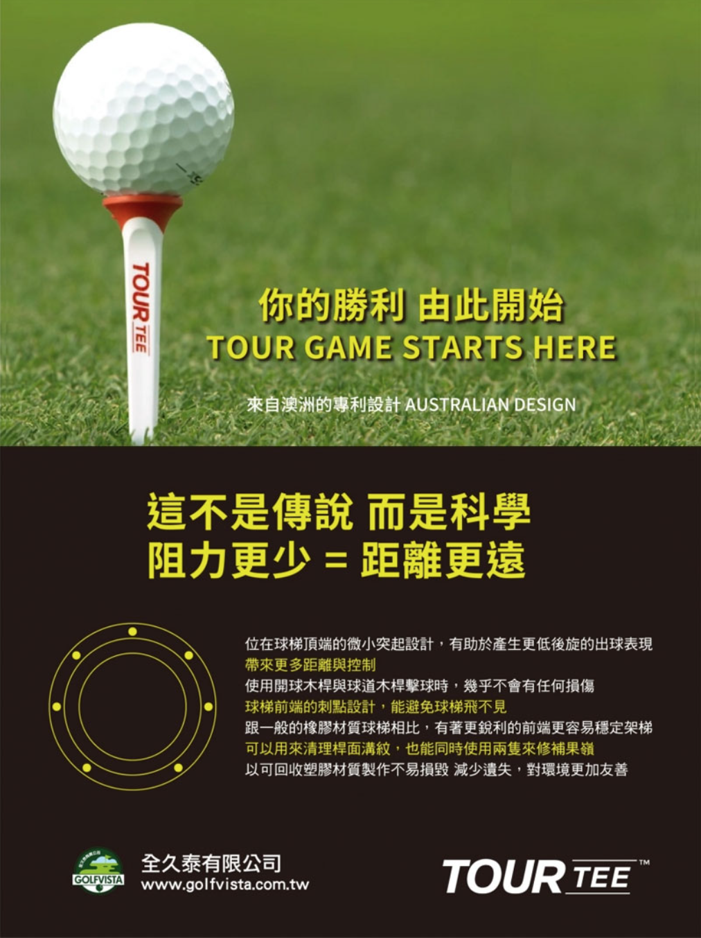 等一下,我們還可以作為桿面凹槽清潔器和果嶺叉,此外,我們的 Tee 符合 USGA 和 R&A 標準,因此沒有人可以再次擊敗您。