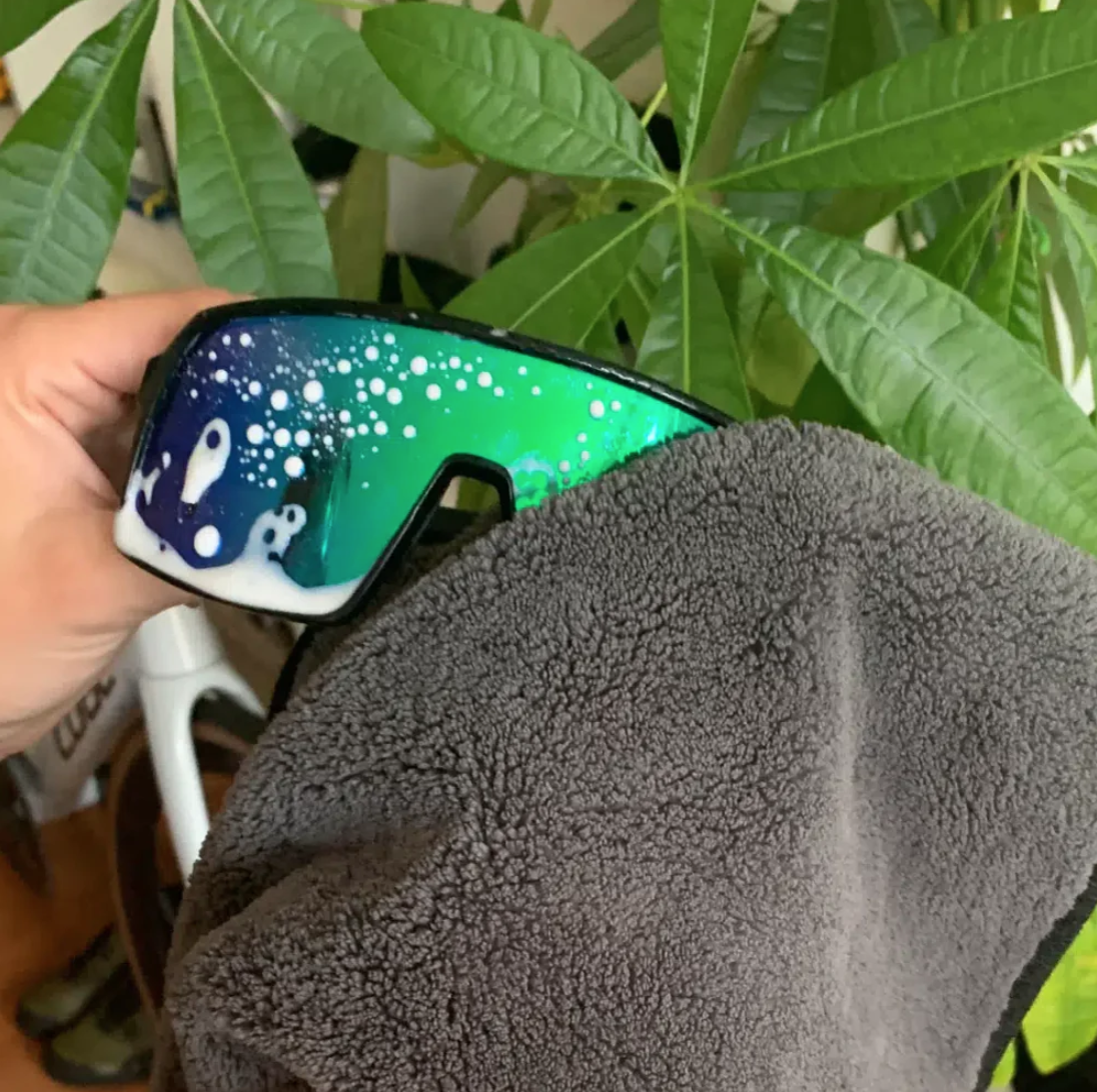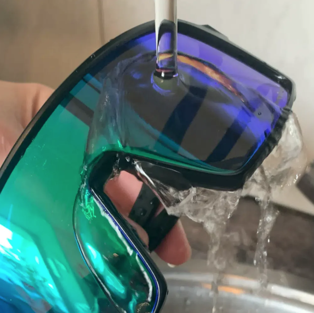 如果你是在泥濘或是滿是塵土的環境下騎乘,並且鏡片上沾附許多泥水污垢,聰明的做法是先使用冷水沖洗鏡片,這樣可以去除鏡片上絕大多數的污垢及沙子,確保接下來的步驟不會刮傷鏡片,切記,請勿使用熱水,它會使鏡片變形、脫膜,使其無法再使用。