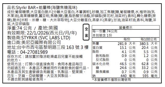 - 每條含 45g 碳水化合物 與 15g 植物性蛋白