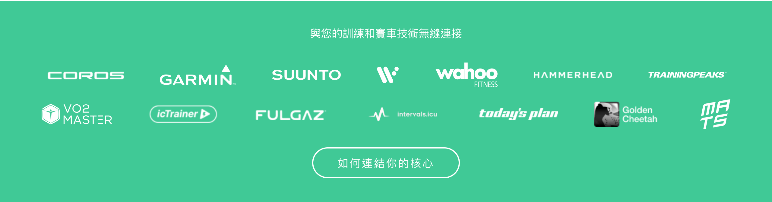 CORE APP可在 iOS 和 Android上下載使用,與大多數的Garmin手錶、自行車碼表相容,同時也兼容COROS、Suunto、Wahoo 和 Hammerhead 的多數設備。搭配與 Apple 和 wearOS 手錶的功能仍然有限,但已有所改善。訓練軟件包括 Today’s Plan、Intervals.icu 和 Golden Cheetah。Training Peaks 的高級版本也兼容。請參閱 CORE 感測器相容性頁面以獲取完整詳細資訊,我們會持續更新相容設備與軟體列表。