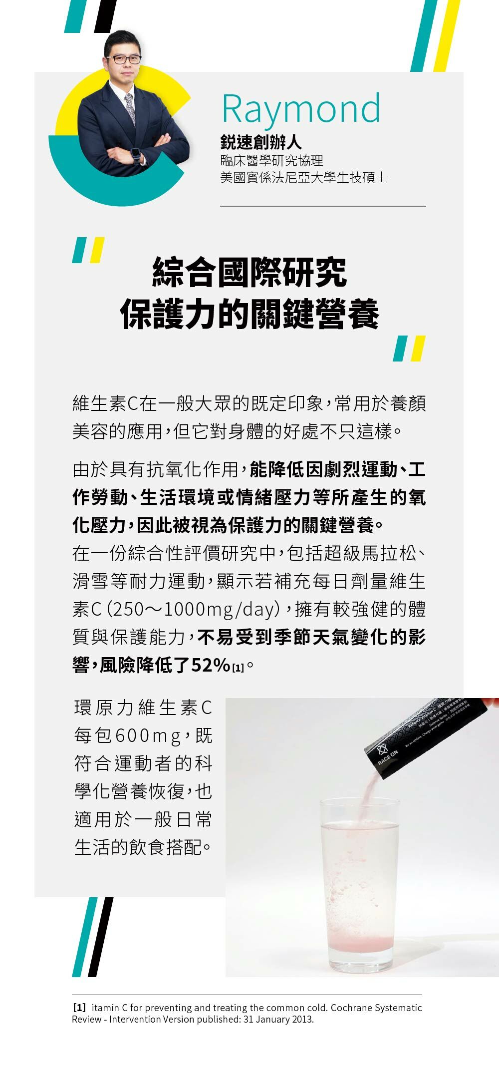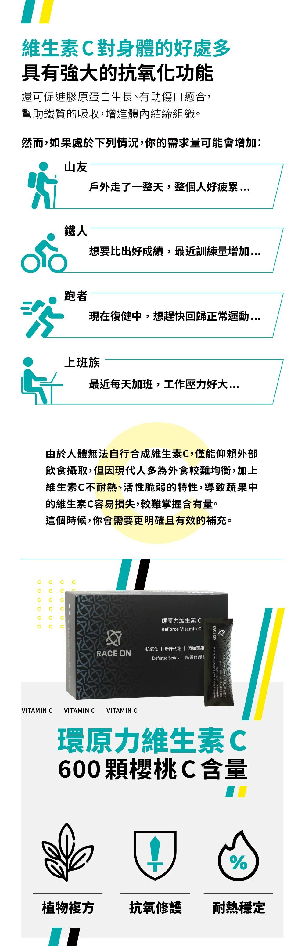 A:維生素C屬於水溶性物質,容易隨著水份排出而流失,即使一次攝取較高單位的維生素C,也無法確保良好保留或吸收,因此鋭速運動醫學將其設計為與水沖泡後使用,符合水溶性本質,且也可以分批次飲用,有助效果。