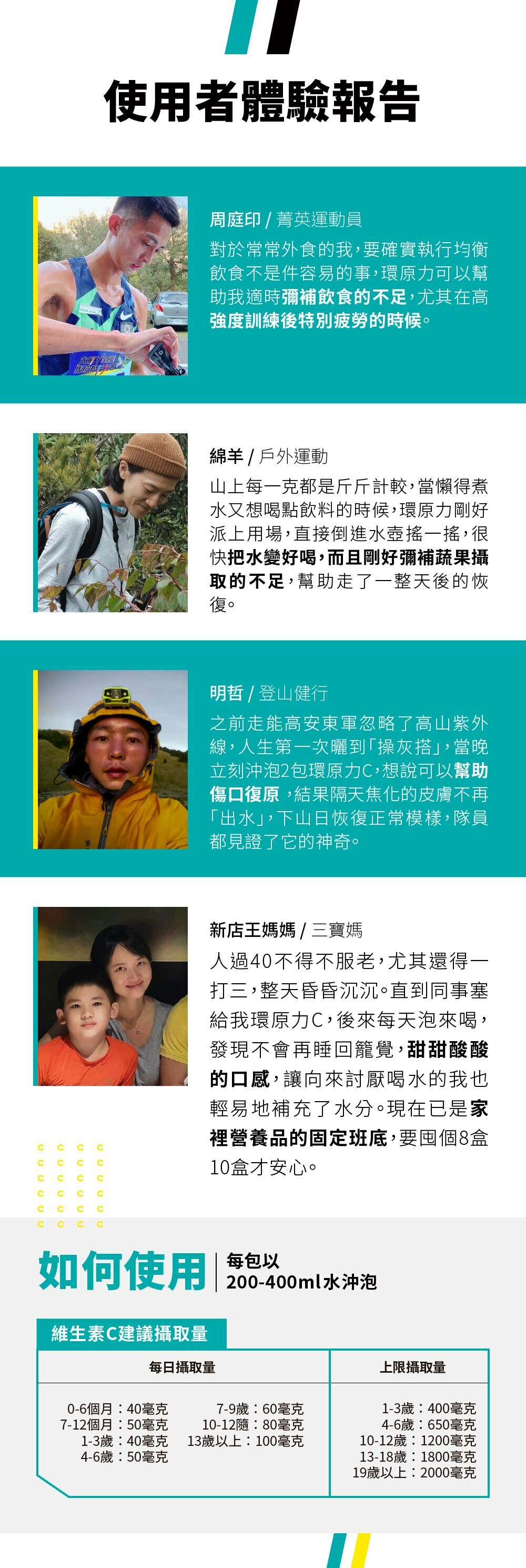 A:將粉末與水沖泡後直接飲用,維生素C因具抗氧化作用,且有助於體內結締組織生長,為運動恢復的重要營養素,建議可於強度訓練及賽事前後使用,原則上不分時段皆適合使用。